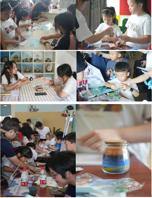 展区中央主题展板后面区域是参展队伍互动游戏区。参展队伍设置游戏摊位,每个摊位都设计了具有该队特征的小游戏,如SUSTech-MED团队的手工沙瓶画DIY小活动,SCUT-China,SCAU-China,SUSTech-OCE的拼图游戏,CSU-China的DNA双螺旋积木小游戏,绘画培养基、涂色游戏等。游戏区丰富了展览的互动形式,加深了公众对各参展队伍的项目理解,提升了参与的乐趣,促进了观众在展览间的流动。这种寓教于乐、集互动与奖励于一体的设计获得家长们的一致好评。