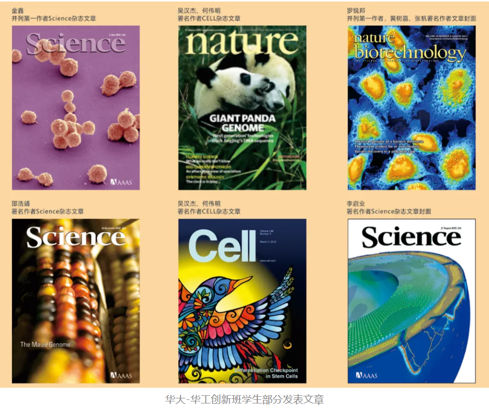 自2009年开设以来,华大-华工创新班已培养15届共122名学生,在联合培养期间先后共有148人次以第一作者、并列第一作者或署名作者身份在国际学术期刊上发表研究成果124篇,其中59人次以第一作者、共同第一作者或署名作者身份在Nature、Science、Cell等国际顶尖学术期刊及其子刊上发表高水平论文共44篇。2022年华大发表的系列研究成果中,也常出现庄镇堃、黄甫保钱、林晓倩等华大-华工创新班学生的名字,他们主导或参与的研究成果包括全球首个非人灵长类动物全细胞图谱、猕猴大脑皮层多组学细胞图谱、大规模人类肠道可培养细菌基因组图谱等。