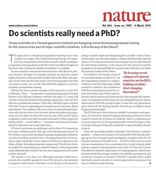 2010年,《自然》杂志专门为此刊发社论文章《科学家是否需要博士学位?》,称这一创新人才培养模式正在颠覆传统——让年纪轻轻的学生参与到重要的科技创新中来,并指出“这是未来的发展方向吗?”