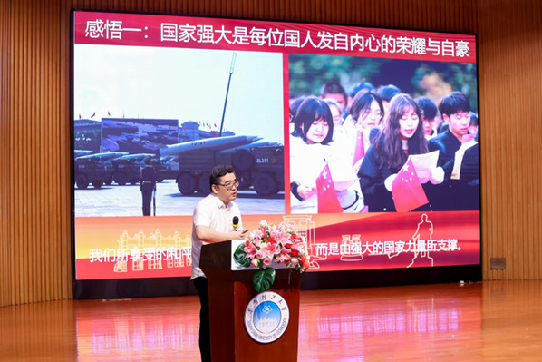 在分享阅兵感悟时,熊伟院长引导同学们思考国家强大、个人奋斗以及个人与国家关系的重要意义。他强调,国家的繁荣昌盛是每位中国人的骄傲,强大的祖国为我们赢得了世界的尊重;奋斗是国家和个人发展的基石,众多先进装备背后是科研人员的不懈拼搏;个人只有将理想融入国家发展,才能实现更大的人生价值。