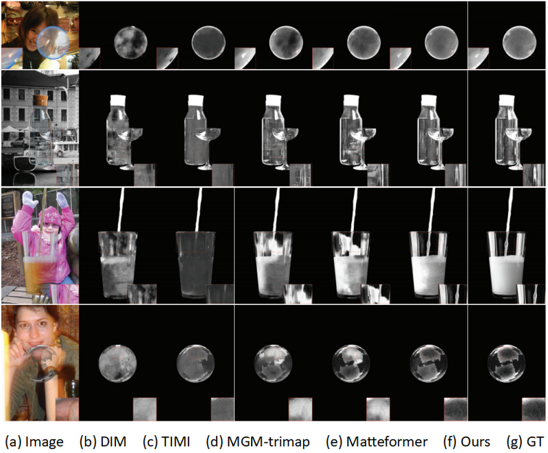 三、卓越性能:高分辨率抠图的实验验证 图5和图6展示了集成了HRIMF-AMR框架的抠图方法在通用抠图数据集Composition-1K的训练集上训练后的模型,在Transparent-460(高分辨率真实透明物体数据集)和Alphamatting(经典抠图基准数据集)上的测试结果,印证了HRIMF-AMR框架的优越性。 图5:集成了HRIMF-AMR框架的方法在Alphamatting高分辨率测试集上的视觉对比结果。 图6:集成了HRIMF-AMR框架的方法在Transparent-460 高分辨率测试集上的视觉对比结果。