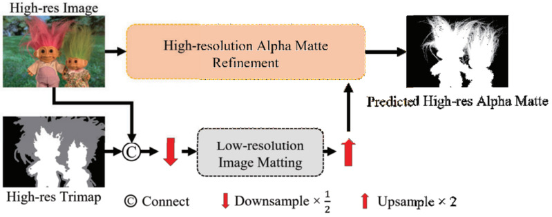 为了克服现有方法的不足,智能算法研究中心与贵州民族大学以及电子科技大学中山学院合作研发出了一个开源的高分辨率自然图像抠图框架——HRIMF-AMR(High-Resolution Natural Image Matting by Refining Low-Resolution Alpha Mattes)[10]. HRIMF-AMR通过精炼低分辨率前景遮罩实现高分辨率自然图像抠图。实验结果表明,该方法不仅在高分辨率图像抠图领域的表现上比现有所有的抠图模型都更优秀,还帮助现有抠图方法提升了对于复杂场景下边缘细节的捕捉能力。目前,关于HRIMF-AMR的研究成果已在国际顶级期刊IEEE Transactions on Image Processing(JCR一区,影响因子13.7)上发表,并开放了代码(https://github.com/yexianmin/HRAMR-Matting)供研究者们使用和验证。