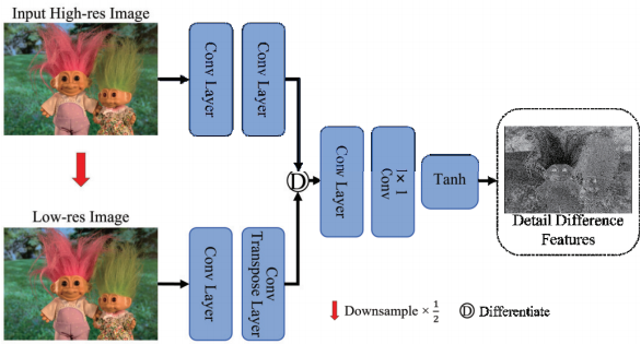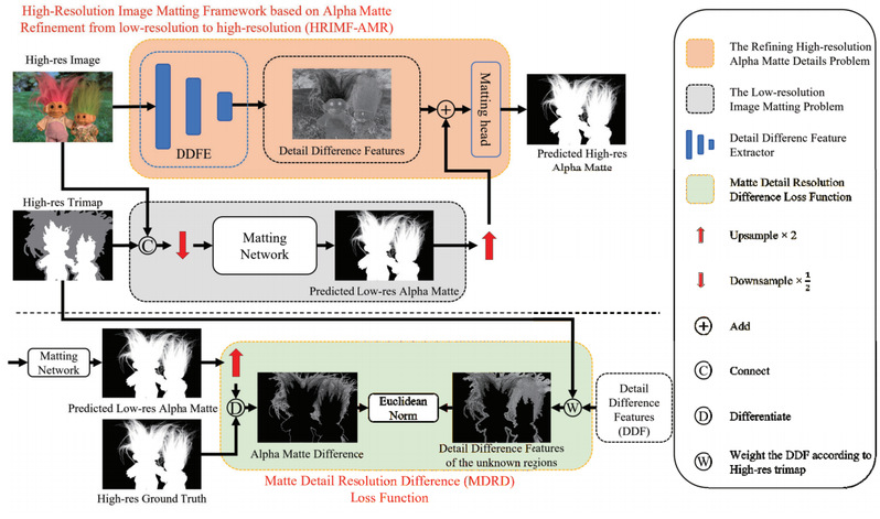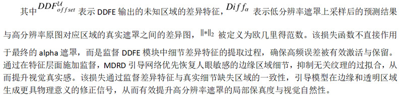 二、精细捕捉:精炼低分辨率前景遮罩的高清抠图 HRIMF-AMR是一种基于低分辨率遮罩精炼的高分辨率图像抠图新范式,通过高分辨率和低分辨率图像之间的差异特征提取来恢复细节信息,避免了直接在高分辨率空间中进行全局建模带来的计算负担。整体流程如图2所示。该方法首先在低分辨率输入上生成初步的前景遮罩,再利用高分辨率原图与之对应区域的语义差异,通过提出的细节差异特征提取器(DDFE)捕捉缺失的精细结构。同时引入遮罩细节分辨率差异(MDRD)损失函数,约束特征提取过程,强化对边缘纹理与透明区域的细节还原能力,使精炼后的高分辨率遮罩在复杂背景下仍保持自然过渡与精确边界。随后,在有限的计算成本下获得了一张清晰的高分辨率前景遮罩。 图2:HRIMF-AMR流程和这两个问题通过所提出的方法转换之间的关系。 HRIMF-AMR的具体框架结构如图3所示。下面我们将具体介绍该方法的核心思想和两个重要模块(DDFE和MDRD)。 图3:HRIMF-AMR的整体结构以及MDRD损失函数的计算过程。 (一)核心思想 HRIMF-AMR的核心在于通过低分辨率遮罩的高效生成与高分辨率细节的精准还原之间的协同优化,实现计算效率与抠图质量的平衡。其关键在于不直接在高分辨率空间进行全局预测,而是利用低分辨率遮罩作为初始估计,结合原图的局部细节差异进行细节补偿。这一思想不仅降低了内存占用,还显著提升了模型对发丝、烟雾、玻璃等复杂边缘区域的刻画能力,为高分辨率图像抠图提供了可扩展且高效的解决方案。 (二)差异捕捉:细节差异特征提取器(DDFE) 针对低分辨率前景遮罩上采样后细节缺失的问题,团队专门设计了DDFE 核心模块,如图4所示。其关键点在于:高分辨率图像的细节损失并非随机,而是集中在特定高频区域。该模块通过对比高分辨率原图与降采样低分辨率图像的特征差异,精准定位并捕捉被丢失的发丝边缘、透明纹理等关键细节,为高分辨率前景遮罩精修提供 “精准素材”。 图4:DDFE的网络结构。 (三)细节约束:遮罩细节分辨率差异(MDRD)损失函数 为让模型更聚焦核心细节,团队引入遮罩细节分辨率差异(MDRD)损失函数。该损失的定义为: