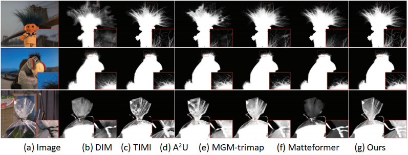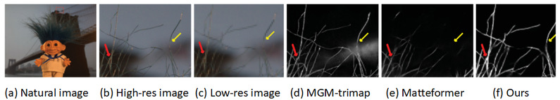 一、直击痛点:高清抠图的无解悖论 现有技术处理高分辨率图像时,始终存在无法调和的矛盾: (一)直接硬算的“算力陷阱”:若直接对4K、8K 图像建模,模型的计算量会呈指数级增长[1, 2, 3],即便是高端GPU也难以承受,推理速度常跌破每秒1帧,完全无法满足影视后期、实时直播等实际需求; (二)降采样处理的“细节牺牲”:为节省算力,多数方法会先将图像降采样至低分辨率(Low-resolution)生成基础的Alpha Matte,再通过上采样还原尺寸[4],或者对图像进行分块处理[5, 6]生成基于块的Alpha Matte再通过上下文信息恢复原始尺寸。但这些方式会严重丢失高频细节,导致发丝断裂、边缘模糊,透明物体的透光质感更是无从谈起,最终结果与“高清”需求相去甚远。 如何在控制计算成本的同时,完整复原高分辨率图像中的精细前景信息?这一核心难题,成为制约视觉创作向“超高清时代”迈进的关键瓶颈。近年来,渐进式精细化(Progressive Refinement)[7]与分治策略(Divide-and-Conquer)[8, 9] 逐渐成为主流思路。通过由粗到精的多阶段优化,渐进式方法在低分辨率特征图上初步定位主体轮廓,再逐步恢复细节纹理,有效平衡了效率与精度;而分治策略则将大尺寸图像切分为重叠图块并行处理,辅以边缘融合算法消除拼接痕迹,在降低单次计算负荷的同时保留局部精细结构。两类思路虽各有侧重,但核心均在于重构图像信息的处理范式——不再追求全局一次性建模,而是通过空间或层级上的分解,实现对高分辨率输入的高效感知与精细化输出,为超高清时代下的视觉生产提供了切实可行的技术路径。但是这些方法仍面临上下文断裂与跨块一致性难题,尤其在处理大尺寸图像中长距离依赖关系时,局部优化易导致语义错位。图1给出了一些例子。