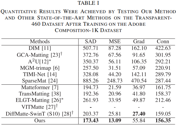 在定量实验方面,首先,为了比较模型的泛化能力,使用Composition-1K训练得到的模型在Transparent-460上进行测试,表现结果如表1所示。结果显示,本文方法在SAD、MSE和Conn三项指标上均显著优于现有方法,相比于基于Transformer的抠图方法,SAD降低9.84%到33.79%,MSE降低37.55%到61.44%,Conn也降低了1.70%到26.41%。这反映了集成了HRIMF-AMR的抠图方法在处理透明物体时,细节还原能力提升明显。