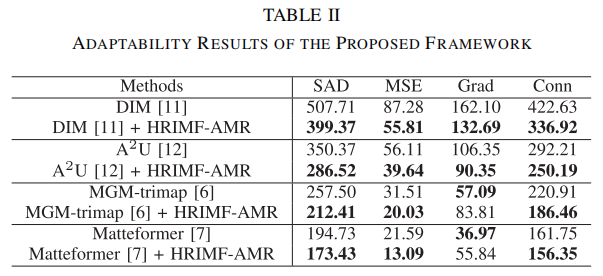 表2展示了HRIMF-AMR在适配到不同的抠图方法上的性能表现。这一表现帮助现有抠图方法提升了对于复杂场景下边缘细节的捕捉能力。 此外,本研究还涉及高分辨率补偿有效性的验证实验、在Transparent-460数据集上测试的消融实验、复杂性分析等。更多实验细节与数据结果,欢迎阅读完整论文。 综上所述,HRIMF-AMR在高分辨率图像抠图任务中展现出卓越的性能,不仅有效解决了高分辨率下边缘细节丢失的问题,还显著提升了透明物体边界的准确性与自然度。其分步优化策略兼顾了计算效率与结果质量,为复杂场景下的高质量图像抠图提供了可靠框架。实验结果表明,该框架在多种主流抠图模型上均能稳定提升性能,尤其在处理透明材质与复杂背景交织的场景时,展现出更强的鲁棒性与细节还原能力,进一步验证了其通用性与实用性。然而,当前方法在极端光照条件下的表现仍有提升空间,且对极薄透明结构的完全恢复仍具挑战。未来,智能算法研究中心将进一步探索,期望进一步提升HRIMF-AMR的性能,并推动高分辨率自然图像抠图技术的发展,使其在更多领域得到广泛应用。