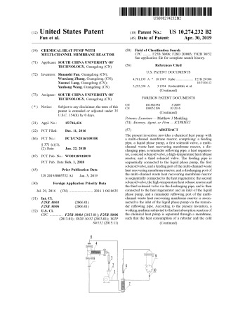 2019年4月30日,团队申请的美国发明专利 Chemical Heat Pump with Multi-Channel Membrane Reactor(US 10274232 B2)获美国专利与商标局授权。