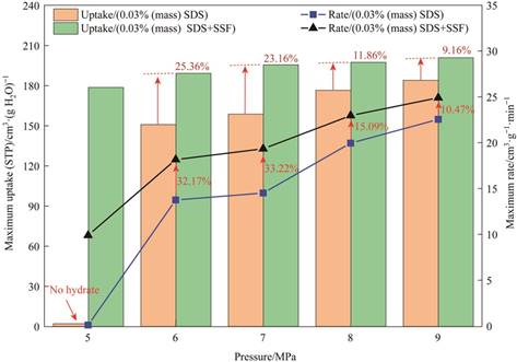 图1 在SSF和SDS存在时甲烷水合物的最大储气量和储气速度比较