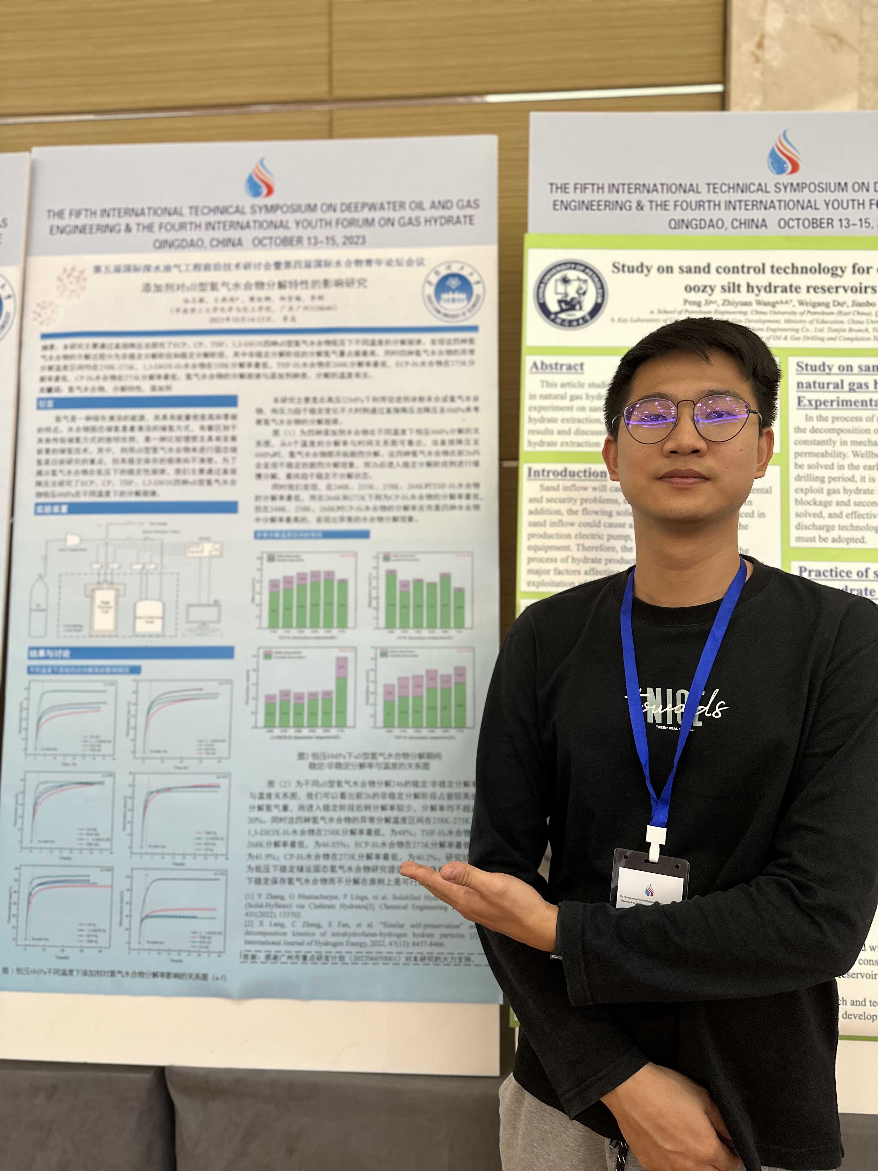 2023年10月13日至10月15日,华南理工大学郎雪梅副研究员与王燕鸿副研究员率硕士生李新颖、林浩烽、刘佩、吴树、伍志敏、许正祥、张尚钰一行七人赴青岛参加第五届国际深水油气工程前沿技术研讨会暨第四届国际水合物青年论坛。王燕鸿副研究员任分会主席,李新颖、林浩烽、吴树、许正祥作口头汇报;刘佩、伍志敏、许正祥作墙报展示。