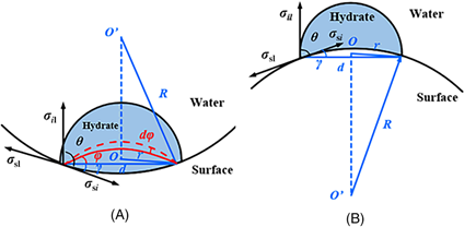 图1 水合物在(A)凹面和(B)凸面上的成核示意图