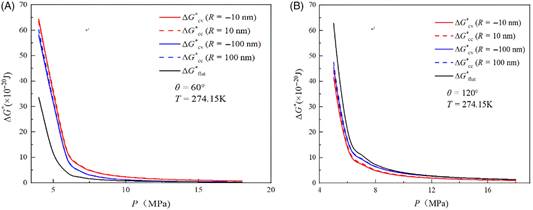 图2 甲烷水合物成核势垒随系统压力(T = 274.15 K)在不同曲率表面上的变化: