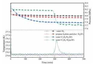 图 1. 不同生成方法下丙烷 - 氢气水合物的压力与温度变化曲线(274.15 K,18.2 MPa)