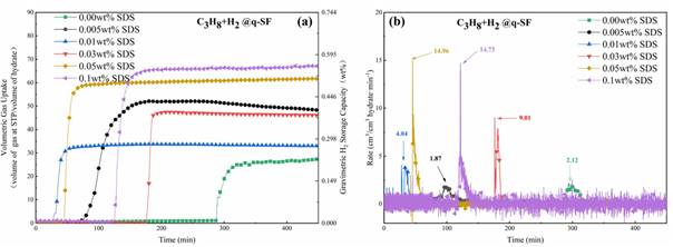 图 3. 不同 SDS 浓度下 q-SF 方法的储氢容量与瞬时速率曲线(274.15 K,18.2 MPa)
