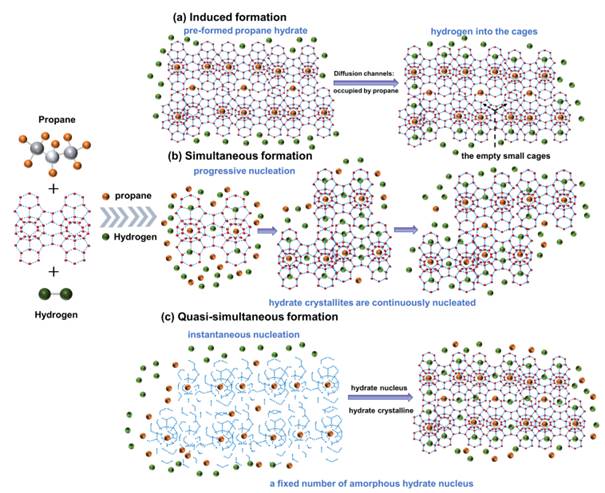 图 4. 不同生成方法的水合物形成机制示意图:(a)诱导生成法;(b)同时生成法;(c)准同时生成法