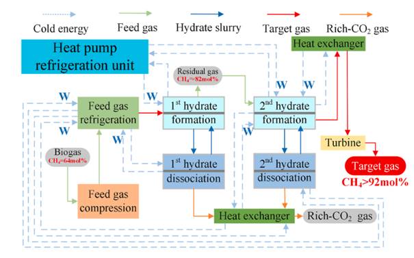 生物气作为可再生能源,其高浓度 CO₂会降低热值,脱碳升级是实现高效利用的关键。传统脱碳技术(如化学吸收、低温分离)存在能耗高、设备腐蚀、成本昂贵等问题,而水合物法脱碳(HBBDC)因原料成本低、绿色无污染、抗杂质干扰能力强等优势,成为极具潜力的技术路径。但该技术目前面临能量消耗占比不明确、关键参数影响机制不清、㶲损失严重等问题,制约了工业化推进。