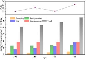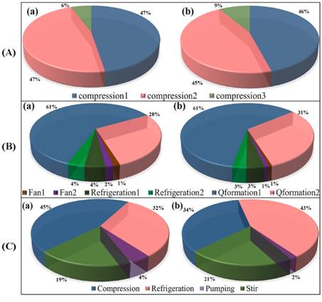 图 1. 不同压力下的能量消耗构成分布(a:3 MPa;b:1 MPa;G/L=100)