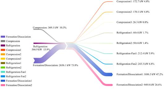 㶲分析进一步定位了能量损失核心(图 3)。过程总㶲损失占输入功的 86.9%,其中两段水合物生成 - 解离单元的㶲损失占比达 73.8%(第一段 47.2%、第二段 26.6%),主要源于气液混合不可逆性、反应熵增及冷能浪费;压缩单元㶲损失仅占 10.4%,远低于其能耗占比;风机冷却单元因高温气体直接降温,㶲损失占 12.7%。这表明,回收解离过程冷能、优化反应器传热传质是提升㶲效率的关键。基于㶲分析结果,通过能量回收优化(图 4):利用水合物解离冷能预冷压缩后原料气,结合目标气压力能回收(涡轮发电),总能耗从 4111kW 降至 3195 kW,降幅 22.3%;能量成本降至 0.451 kWh/kg CO₂,显著低于化学吸收(0.486-1.053 kWh/kg CO₂)和低温分离技术,与膜分离、变压吸附相当,且原料成本更低、环境友好;产品气净发电量达 6.8 kWh/Nm³,进一步提升了过程经济性。