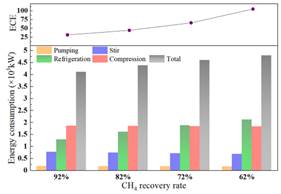 关键参数敏感性分析揭示了能耗调控规律(图 2):气液比(G/L)从 100降至 40 时,TBAB 溶液循环量增加,搅拌能耗飙升 134%,导致总能耗上升 33.6%,需在 CO₂捕获率与能耗间平衡;CH₄回收率从 92% 降至 62% 时,总能耗仅增加 16.7%,但能量消耗效率(ECE)显著上升 238.4%,表明高 CH₄回收率是提升过程能效的关键;两段式压力组合中,1-1 MPa(两段均为 1 MPa)方案的总能耗最低(3581 kW),能量成本降至 0.506 kWh/kg CO₂,目标气 CH₄浓度仍达 90.8%,兼具节能与脱碳效果。