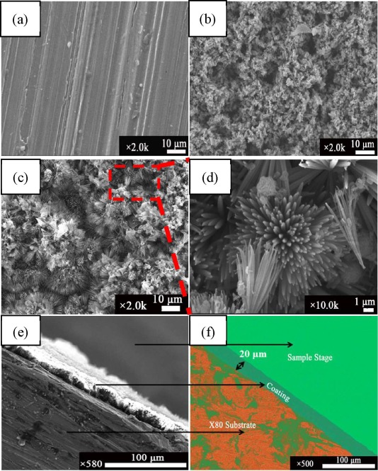 图1 (a)裸露X80;(b)CeO2纳米棒;(c-d)CeO2/pDA@X80涂层从低倍率到高倍率;