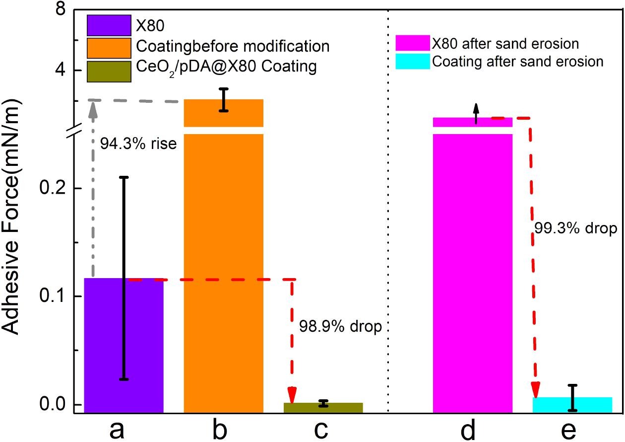 使用MMF装置分别测量了CP水合物与有涂层和无涂层基材之间的附着力。由于金属表面没有预熔层,水合物颗粒与X80表面之间的附着力极其微弱,0.117 mN·m−1。CeO2/pDA@X80涂层在表面修饰前是亲水性的。研究了无表面修饰涂层时的水合物-附着力。结果表明亲水涂层表面的水合物附着力最高,力值为2.070 mN·m−1,是X80的18倍。这种强烈的附着力主要是由于亲水表面粗糙度的增加。更高的粗糙度会导致水合物与基底接触面积更大,因此更多水合物结构嵌入缺陷中,从而带来更好的附着力。然而,对于超疏水性CeO2/pDA@X80涂层时,附着力仅为0.001 mN·m−1,相比X80减少了约98.9%。由于表面自由能较低,涂层表面难以被预熔层润湿,水合物-基底毛细桥也被大幅削弱。然而,毛细桥是水合物-管壁之间粘附的主要机制。因此,在大多数情况下,水合物无法附着在涂层表面。此外,还测量了X80和涂层在2小时砂磨后水合物的附着力。结果确认X80的附着力从0.117 mN·m−1增加到>0.858 mN·m−1。增强的附着力是由于X80表面粗糙,容易穿透水合物壳体。然而,砂蚀涂层的平均水合物附着力仅为0.006 mN·m−1,这表明 CeO2/pDA@X80涂层即使在砂子磨损后仍保持超低水合物附着性能。