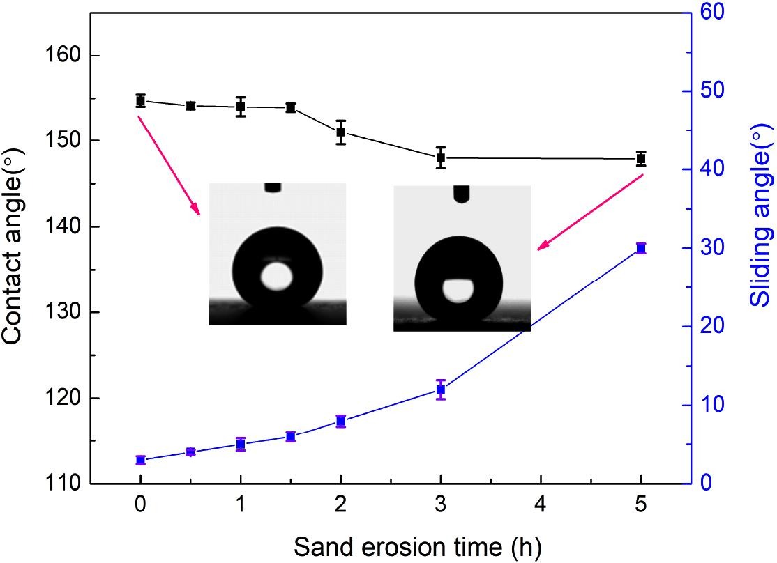 图3 CeO2/pDA@X80涂层在砂侵蚀试验中接触角和滑动角的变化,误差界限表示三次重复测试的平均偏差