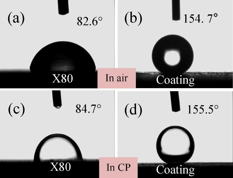 为进一步表征涂层的润湿性,进行了水接触角。如图2(a–d)所示,仿生涂层使X80在空气中的水接触角从82.6°增加到154.7°,在CP中从84.7°增加到155.5°。CeO2/pDA@X80涂层和水滴之间的低附着力归因于现有空气层提供了较高比例的气-固体界面,从而诱导滑滴的运动。