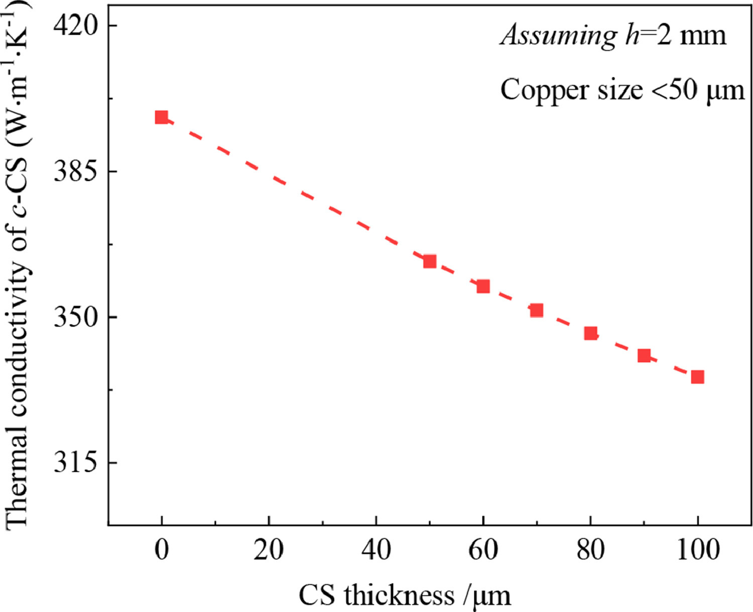 不同 CS 厚度(50–100 微米)的 c-CS 的热导率如图3所示。理论预测结果显示,当涂层厚度为100微米时,50微米铜径下的c-CS热导率降低<15.7%。因此,尺寸为50微米的多孔<铜设计合理,确保在厚度为100微米的涂层下整体热导率降低<20%。