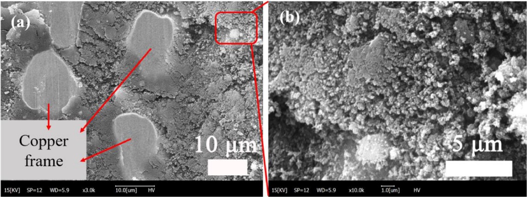 针对这一挑战,华南理工大学化学与化工学院王燕鸿、樊栓狮团队研究制造了既具备超疏水性又具有热导率的CS表面。设计了一个烧结铜微观结构,以提供耐用性和相互连接的导热主链。超疏水性石墨氟化物(CF1.1设计用于防水,环氧树脂(EP)则用于增强铜框架与纳米碳纤维素之间的结合强度。获得的铜尺寸为50微米的CS表面形态如图1所示。该表面由铜和疏水CF1.1 纳米颗粒组成。