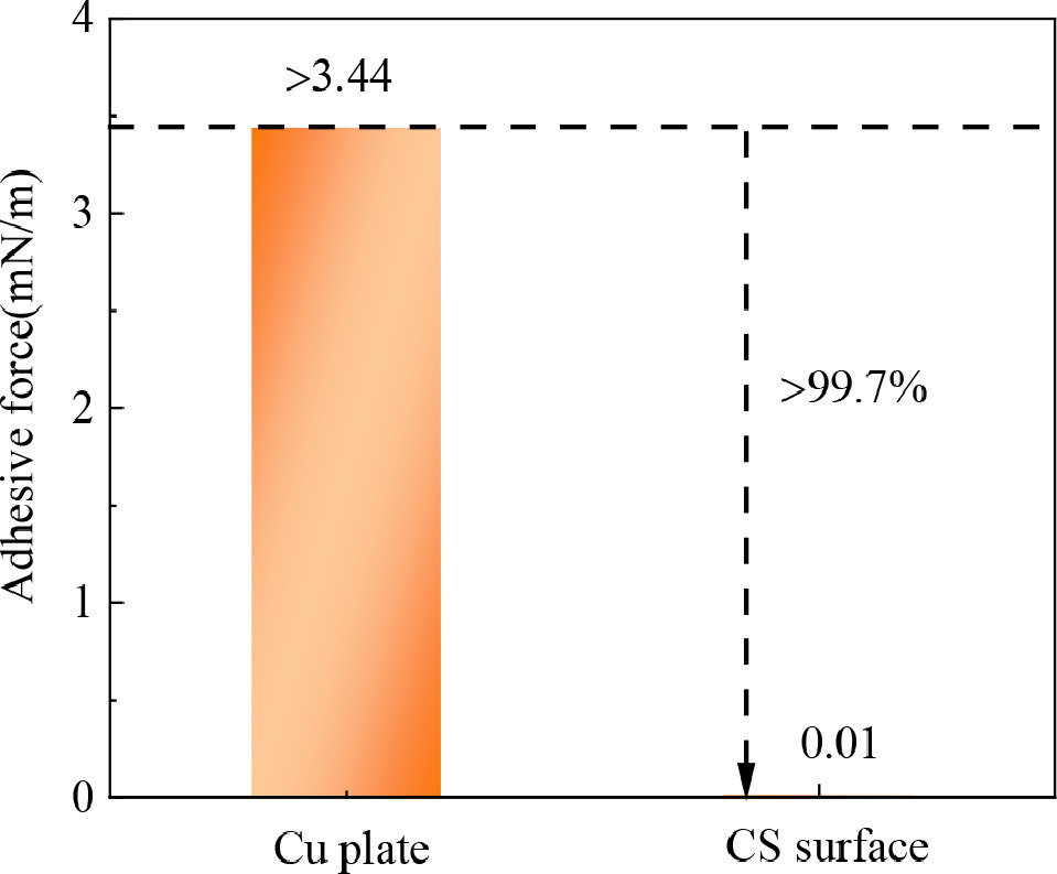 水合物的附着力如图2所示。铜板与CyC5水合物之间的附着力过大,为>3.44 mN/m,超出了MMF装置的测量范围。CS表面的水合物附着力仅为0.01 mN/m,至少比铜板低99.7%。CS表面优异的抗水合物附着性能有效避免 水合物热导率低导致系统能耗持续减少。