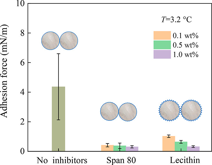 图2 CP水合物在无抗凝集抑制剂或配合抗凝集抑制剂时的平均粘附力