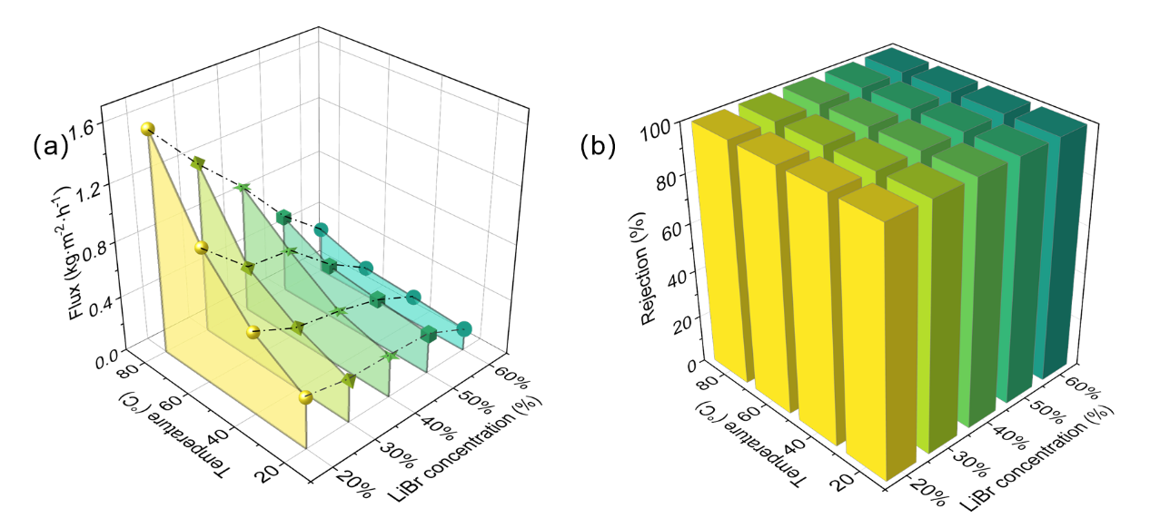图4 DDR沸石膜对不同浓度和温度的LiBr溶液的渗透蒸发脱水的(a)通量和(b)截留率
