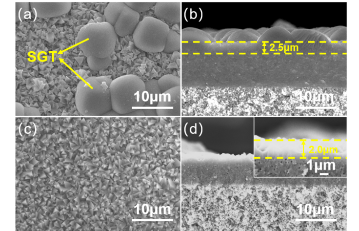 (a) 俯视图和(b) 横截面SEM图像,(c) 横截面EDX映射图,以及(d) XRD图谱