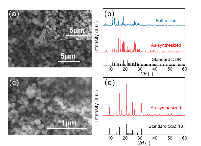 图1 (a,b)DDR 和(c,d) CHA 沸石晶种的 SEM 图像和 XRD 图谱