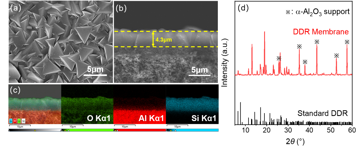 为进一步提高膜的质量,结晶时间从44小时延长至96小时,合成凝胶中的ADA/SiO₂比例从0.03提高到0.05。如图3所示,这一调整显著改善了膜的形貌和完整性。所得到的DDR沸石晶体具有优良的共生性,形成了厚度为4.3μm的连续层,这比在较低的ADA/SiO₂比例(0.03)下合成的膜(1–2μm)厚得多。膜厚度的增加可能归因于在较高模板浓度下晶体生长动力学的加快。横截面EDX mapping显示沸石层内的铝含量极低,从而证实了从α-Al₂O₃载体中浸出的铝量微乎其微。XRD分析进一步证实了相纯度,显示出清晰的DDR结构,未检测到SGT杂质。DDR沸石膜优异的相纯度凸显了异质外延生长策略的独特优势。此外,渗透测试表明,该膜在活化前完全不渗透氦气,这表明晶界缺陷可忽略不计。