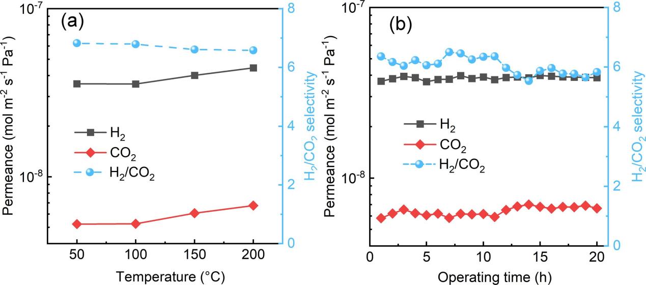 图2 (a) 沸石膜的温度依存性。(b)沸石膜分离50/50H2/CO2的长时间渗透性能