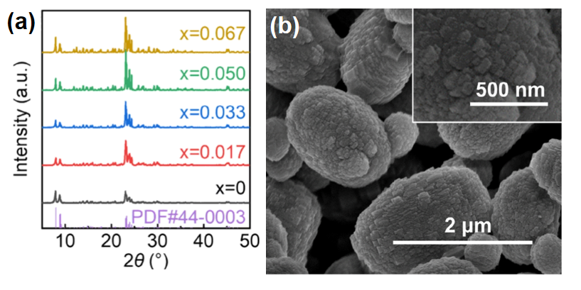 Na2O/SiO2摩尔比和凝胶中的铝源是影响分级ZSM-5沸石形成的重要因素,可以调节其形貌和大小。研究团队首先以Al(Opri)3为铝源,以不同Na2O/SiO2摩尔比的凝胶为原料,初步合成了ZSM-5沸石,考察了碱度对分子筛团聚结构形成的影响。表明以Al(OPri)3为铝源时,控制前驱体溶液中Na2O/SiO2摩尔比小于0.033是获得高纯度ZSM-5聚集体的关键。通过X射线衍射图和扫描电子显微镜图像显示,Na2O/SiO2摩尔比从0到0.067都显示出MFI型的沸石晶体结构(PDF#44-0003)。然而,只有当Na2O/SiO2摩尔比超过0.017时,才能实现最佳结晶度。如图1(b),当Na2O/SiO2摩尔比为0.017时,样品由椭圆形ZSM-5颗粒(0.5-2μm)组成,具有由微小的ZSM-5纳米晶聚集形成的多晶结构。