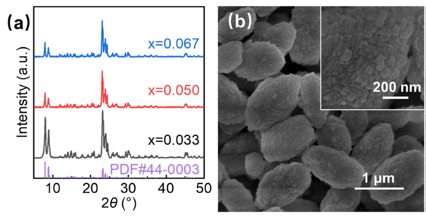 在180◦C下反应24 h,合成样品的X射线衍射谱,(b)x=0.017时的扫描电子显微镜图像