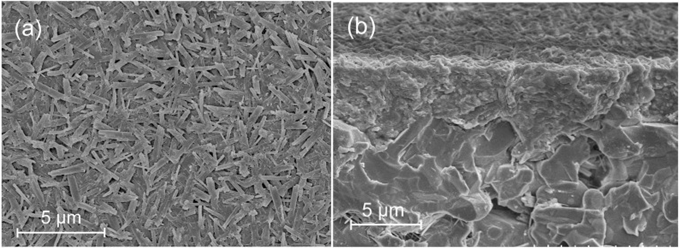 图1 T型沸石膜的SEM图像:(a)表面;(b)横截面