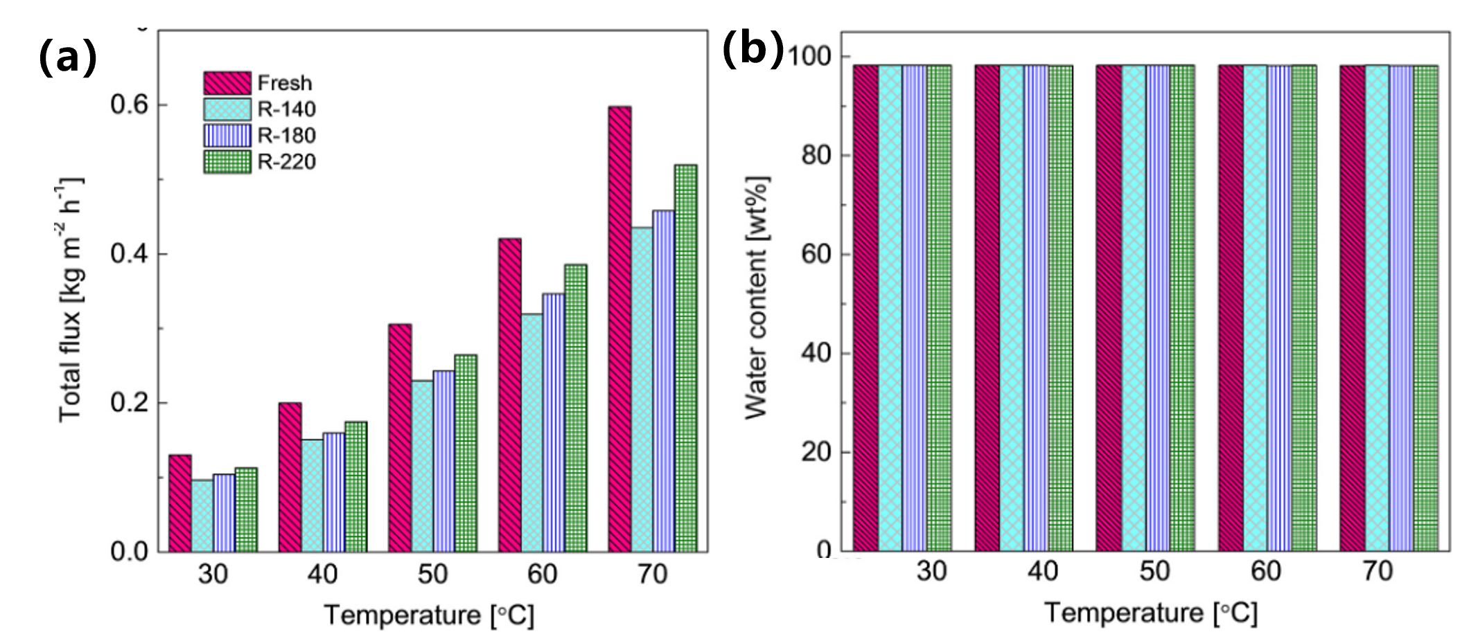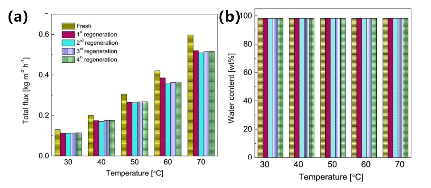 研究发现,T 型沸石膜对生物油中的水分具有高选择性脱除能力,但在脱水初期(前 5 小时),由于有机组分在膜孔内的强吸附作用,膜通量会从 0.58kg・m⁻²・h⁻¹ 快速下降至 0.16kg・m⁻²・h⁻¹,随后进入稳定阶段。通过热重分析证实,有机组分在膜孔内的吸附与滞留是导致膜污染的核心原因。为解决污染问题,团队开发了高温再生策略:将受污染的膜经乙醇清洗后,在 220℃下煅烧 12 小时,可有效脱附并分解孔内有机污染物,使膜通量恢复至接近新鲜膜水平。值得注意的是,该膜经 4 次污染-再生循环后,结晶结构和分离性能仍保持稳定,展现出优异的化学稳定性和重复使用性。