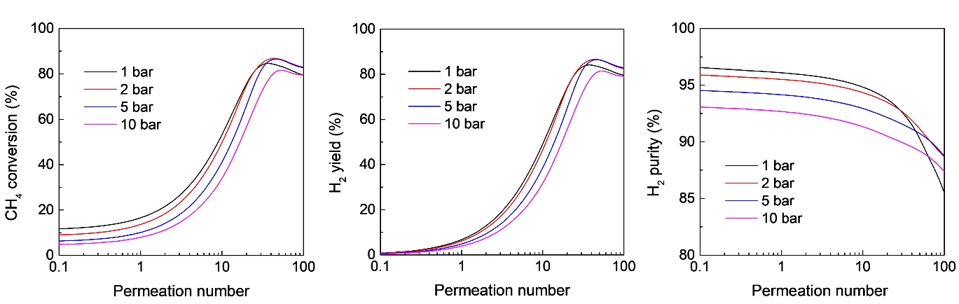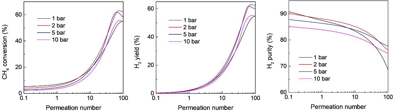 图4.甲烷进料压力对(a)甲烷转化率、(B)氢气产率和(c)氢气纯度的影响,作为膜反应器中MDA渗透数的函数