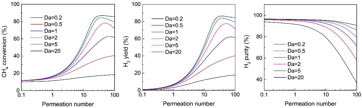 图1. Damköhler数对(a)甲烷转化率、(B)氢气产率和(c)氢气纯度的影响,作为MR中MDA渗透数的函数
