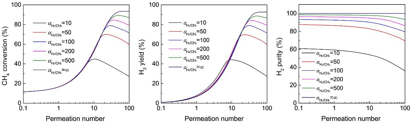 图2. H2/CH4选择性对(a)甲烷转化率、(B)氢气产率和(c)氢气纯度的影响,作为膜反应器中MDA渗透数的函数