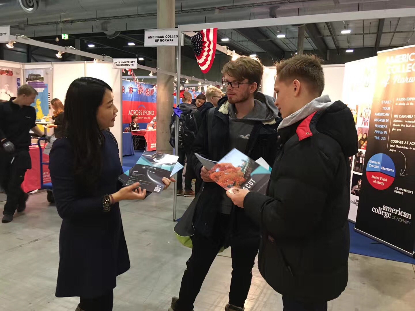 与北极光孔子学院中外方院长合影 1月8日,安然教授和国际教育学院招生办公室主任陈冬梅老师应挪威广州总领事馆推荐,参加了在挪威举行的教育展。这是我校首次参加北欧教育展。安然教授详细地向当地参展学生介绍华南理工大学的概况,引起了当地学生的浓厚兴趣。