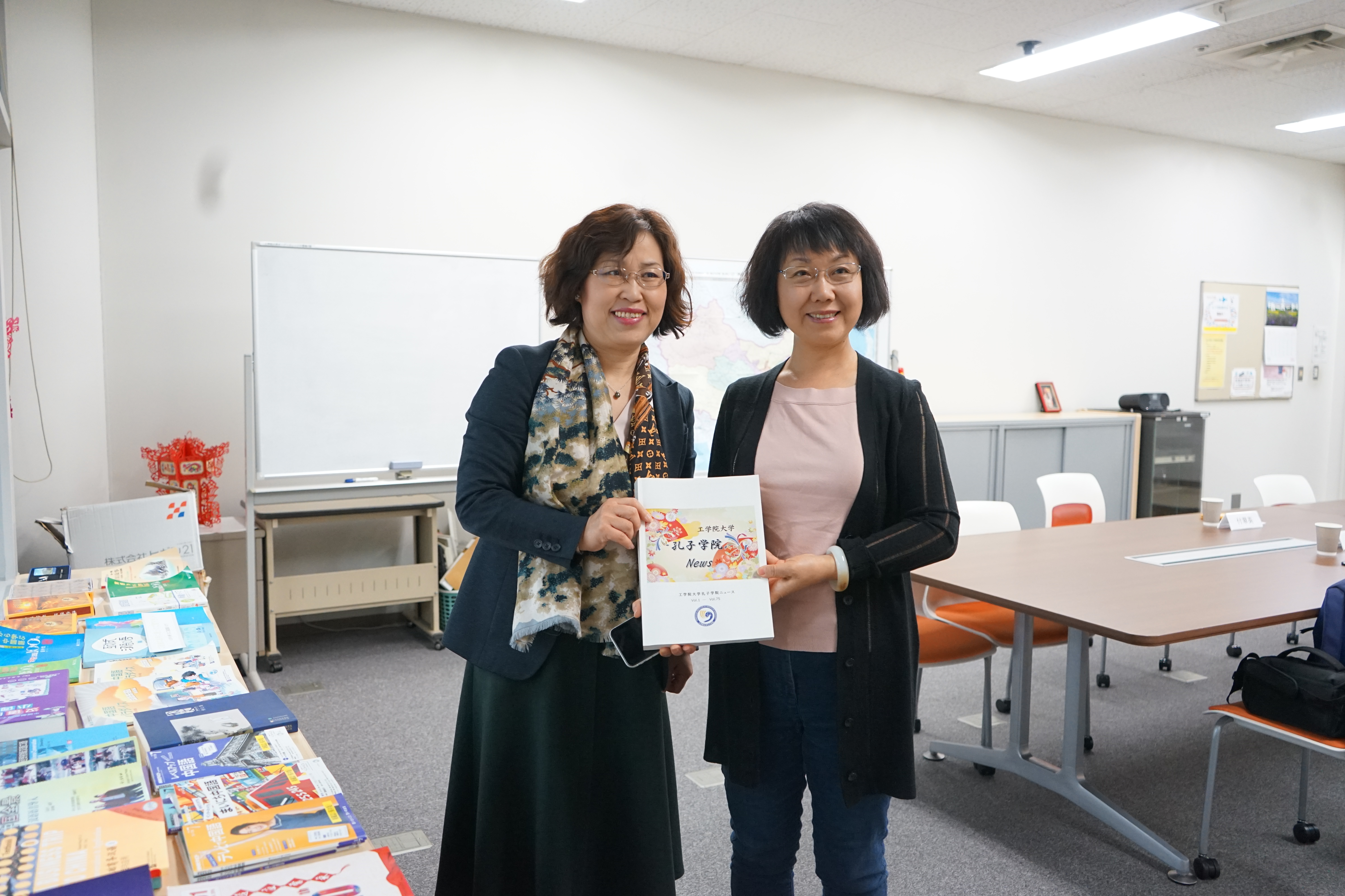 与樱美林大学孔子学院团队合影 第二站,安然教授带领团队调研位于东京新宿区的工学院大学孔子学院。该孔子学院也曾在2013年被授予“先进孔子学院”荣誉称号。团队此次到访受到了外方院长高桥惠子女士和中方院长付翠英女士等人的热情欢迎。两位院长介绍了孔子学院的办学特色、与发展情况等。通过对两位院长的访谈,调研团队了解了该孔子学院的组织架构及市场特色。调研团队随后参观了孔子学院的课室、多媒体教室等。