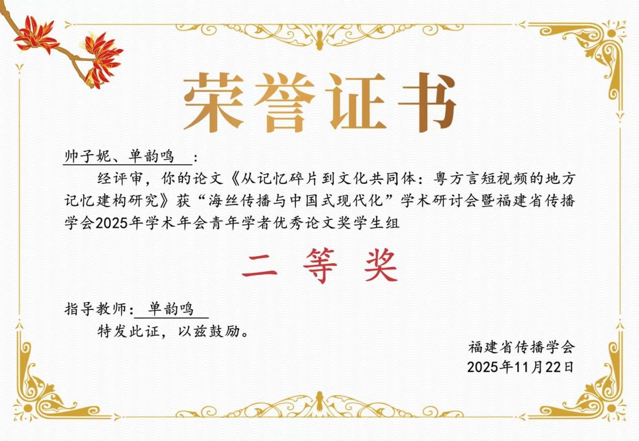 2025年11月,基地2023级硕士生帅子妮的论文《从记忆碎片到文化共同体:粤方言短视频的地方记忆建构研究》在“海丝传播与中国式现代化”学术研讨会暨福建省传播学会2025年学术年会上荣获“青年学者优秀论文学生组二等奖”,指导老师为单韵鸣教授。