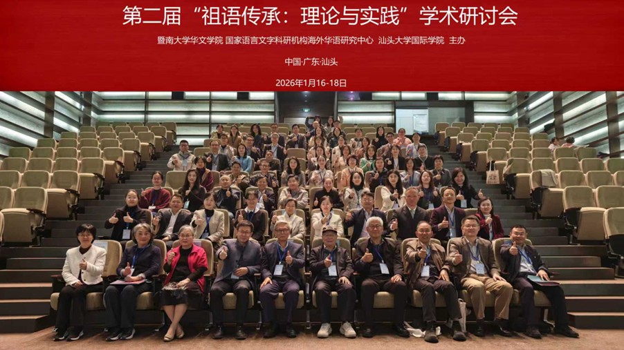 2026年1月16-18日,第二届“祖语传承:理论与实践”学术研讨会在汕头大学桑浦山校区举行。本次研讨会由暨南大学华文学院、国家语言文字科研机构海外华语研究中心、汕头大学国际学院联合主办。来自海内外28所高校的72位专家学者、华文教育工作者及机构代表齐聚一堂,围绕海外华侨华人祖语传承、境外华语资源库建设、百年海外华文学校资料采集整理研究等议题,展开全面深入的研讨。