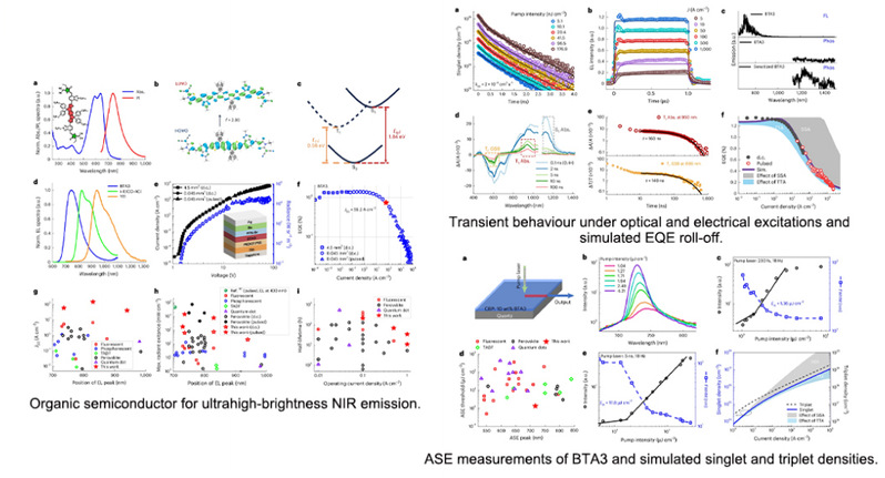 On May 13, the research team led by Prof. Wu Hongbin at SCUT reported their research papertitled Ultrahigh-radiance Near-infrared Organic Light-emitting Diodes in Nature Photonics. Theyproposed a novel strategy to suppress efficiency roll-off in organic light-emitting diodes (OLEDs),through which the quenching of singlet excitons by long-lived triplet excitons was significantlyalleviated, thus enhancing the critical current density to approximately 100 A/cm² under DC driving and10 kA/cm² under pulsed driving, ultimately achieving ultrahigh-brightness near-infraredelectroluminescence with a radiance 147 times greater than that of terrestrial solar irradiance.