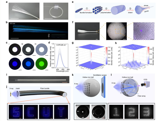 A team led by Professor Dong Guoping from South China University of Technology (SCUT) haspublished a paper titled 'Integrated Copper-halide Activated Scintillator Fiber Array for Remote HighResolution X-ray Imaging' in Nature Communications. The team developed a novel scintillating fiberarray by incorporating nanocrystals into glass fibers. Through precise control of the crystallizationprocess, they fabricated low-loss fibers and subsequently produced a fiber array with 1600 pixels usinga secondary drawing method. This fiber array detector can penetrate complex structures, enablinglow-dose (22 nGyair s-1), high-resolution ( 48 lp mm-1) X-ray imaging and image transmission.
