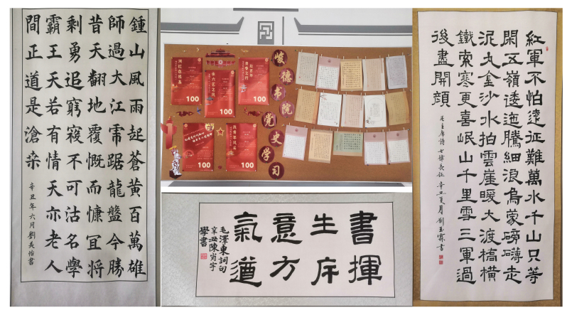 书院辅导员、党支部于义永同志谈到,峻德艺展铭初心,党史学习教育记使命。这场艺术党课用文艺的力量,让我们在书法和绘画中,触摸信仰力量,感受真理光芒,汲取前行动力。这堂党课很有新意,作为一名高校辅导员,我们要创新教育载体,以美为媒,传承好红色基因,以浸润感染引导青年大学生“学党史、强信念、跟党走”,让广大学生深刻理解红色政权来之不易、新中国来之不易、中国特色社会主义来之不易,努力成为堪当民族复兴重任的时代新人,让青春在不懈奋斗中绽放绚丽之花。(文/魏海燕 图/刘博君)