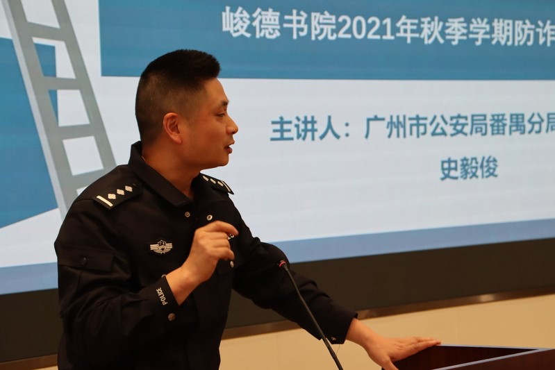维护校园安全,防范诈骗是重点。本次活动,书院邀请了广州市公安局番禺分局一级警司史毅俊警官来到会议现场。史毅俊警官用近期周边各类案例,亲切地为同学们进行校园防诈的相关宣传。他以通俗易懂的语言为广大师生讲解了什么是电信诈骗、电信诈骗的种类,以及校园内易发生的“冒充好友”、“网络刷单”、 “招嫖勒索”、“杀猪盘 ”等电信网络诈骗形式、发案特点,并就近年发生的刷单类、网络贷款类、冒充政法干警、领导(熟人)类等常见的电信诈骗鲜活案例,讲述受害人被骗的经过、分析发案原因,就遇到该类情况的紧急应对方法,怎样防止被骗进行了讲解。他呼吁,在座师生要提升防范诈骗的能力,增强安全防范意识,维护好自身合法权利和校园安全稳定。